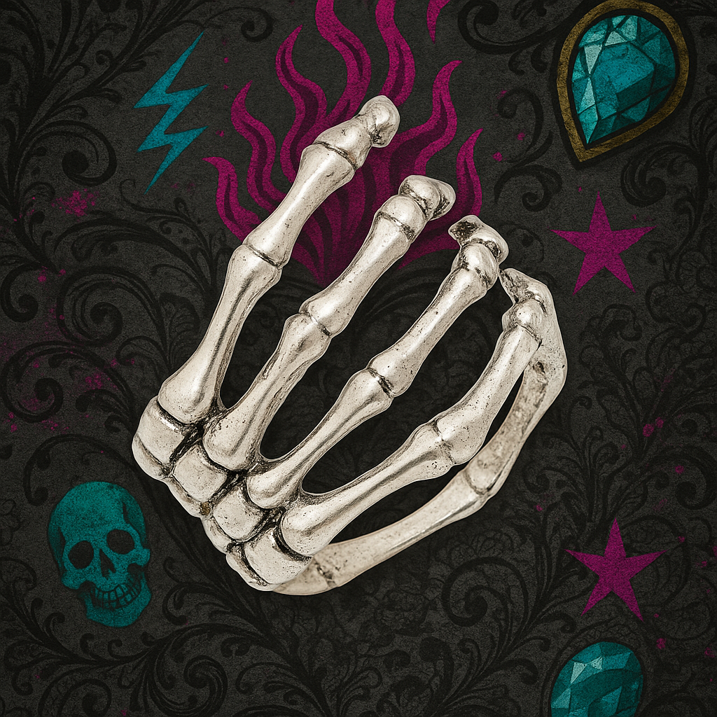 A metal skeletal hand that wraps around your wrist like it’s claiming your soul. Raw, rugged, and unapologetically dark — because sometimes your jewellery should look like it could crawl out of the ground.