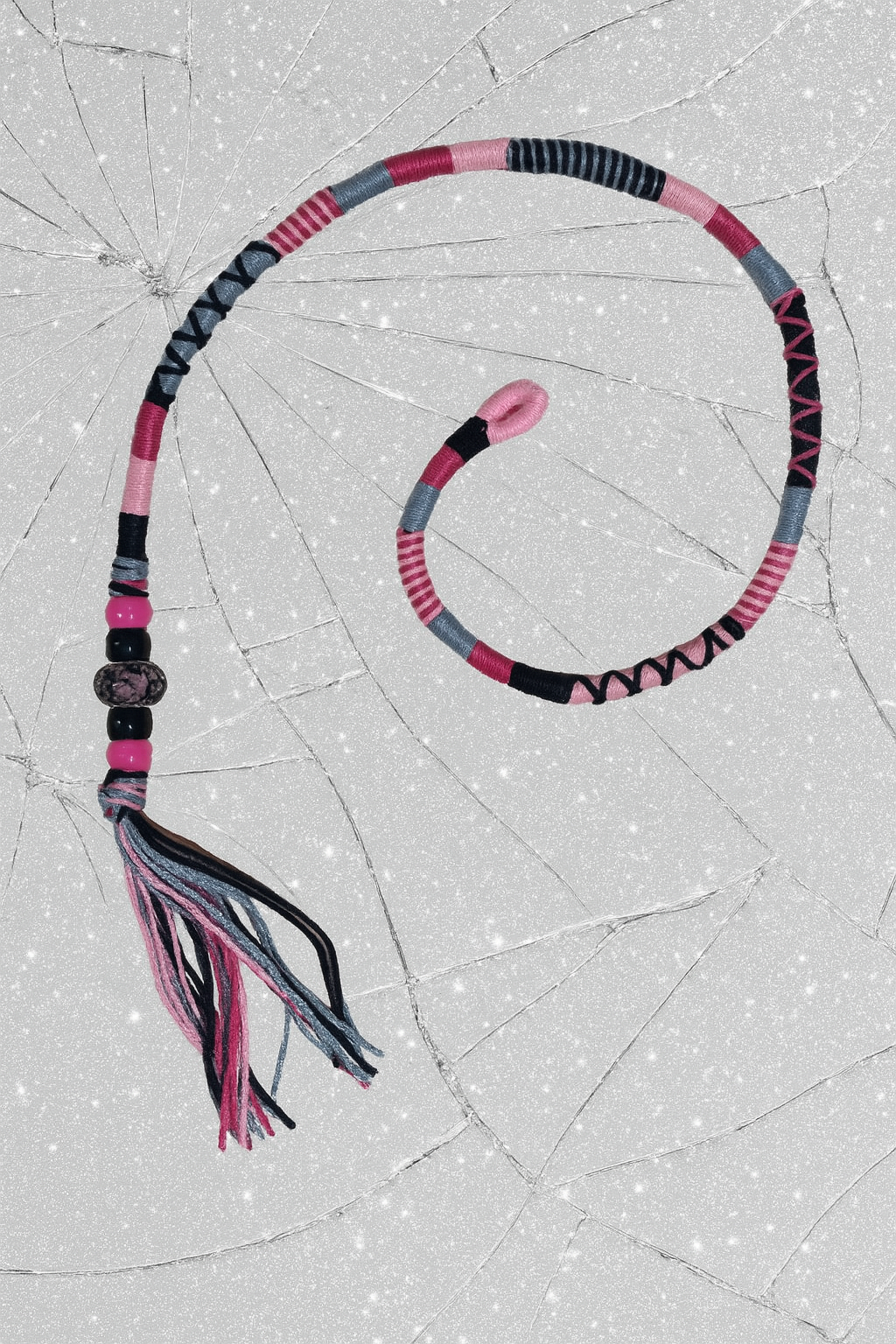 One-of-a-kind handmade hair wrap featuring bold pink, black, and grey threadwork, statement beads, and tassels. Made to stand out — just like you.